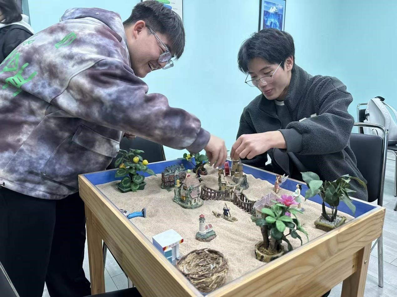 针对民族学院学生所面临的独特成长环境,姚老师进行了深入浅出的剖析。她谈到,同学们在享受大学开放平台带来的机遇时,也客观面临着“文化适应”、“学业转型”与“人际构建”三重挑战。从熟悉的家乡文化切换到陌生的都市环境,从以往的学习模式过渡到强调自主探究的大学学术要求,从同质化的成长圈子融入一个多元文化的大家庭等,这些转变都可能带来思乡之情、自我怀疑与沟通上的困惑。认识到这些挑战的普遍性与正常性是心理健康的第一步。“健康成长,并不意味着没有烦恼和压力,而是指发展出在逆境中反弹的能力,在混乱中建立内心秩序的能力,以及在不确定性中依然保持前进动力的能力。这种坚忍的品格,是大学教育赋予你们最宝贵的财富之一。”随后,在姚老师的带动下,同学们进行了有趣的沙盘游戏,在沙盘模拟中构建了心灵的世界。